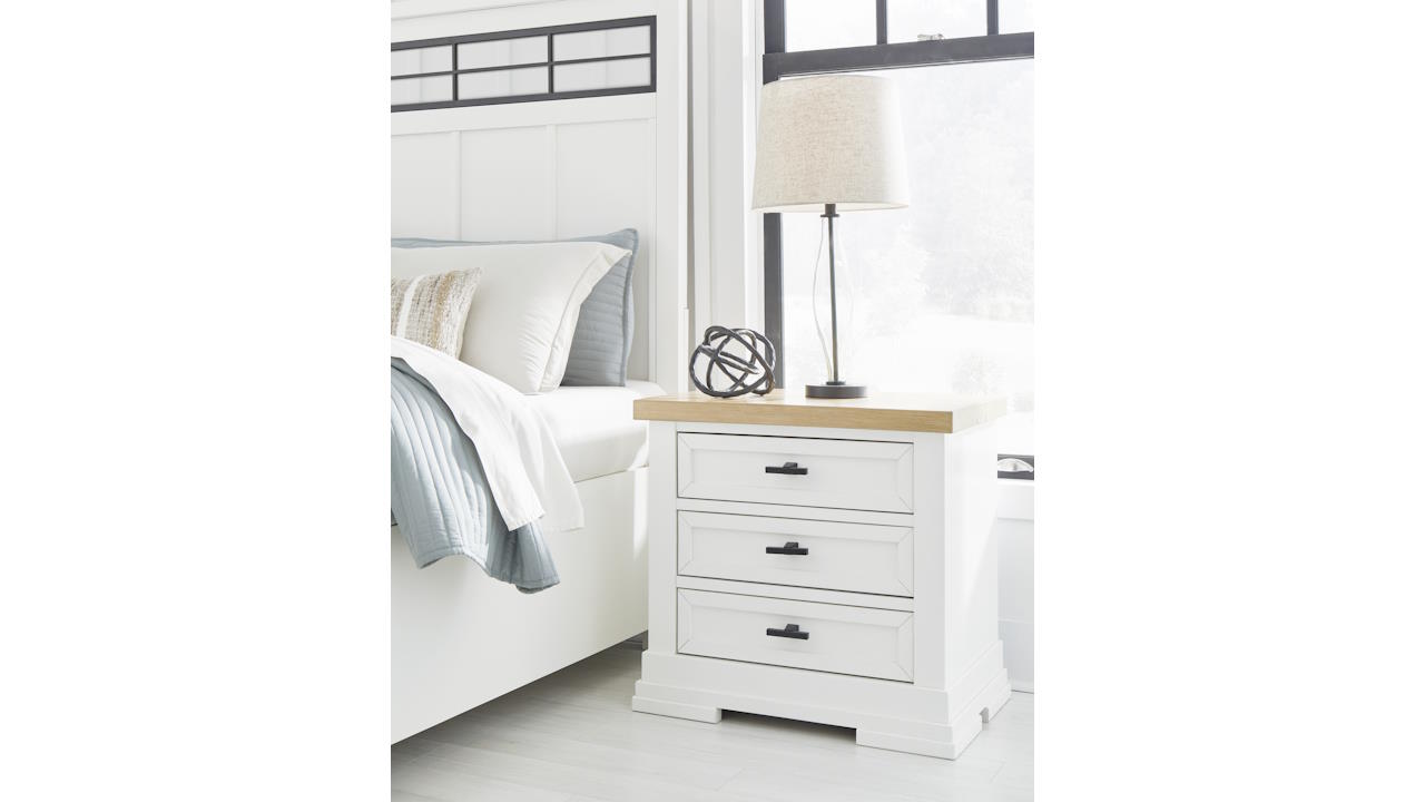 The Ashbryn Nightstand at Home Furniture blends modern farmhouse vibes with practicality, featuring a two-tone finish, sturdy build, three spacious drawers, and integrated power outlets with USB ports for bedside charging convenience.