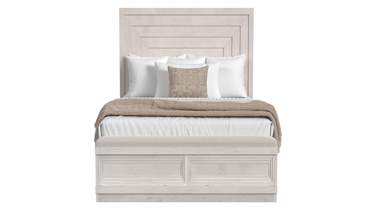 The Avalanche Storage Bed in White features a sturdy wooden frame with a slanted, horizontally planked headboard and four integrated side drawers, blending modern simplicity with rustic charm.