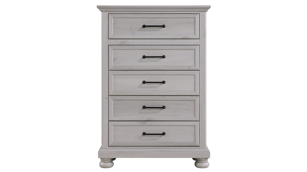 The Bella Chest in Gray features a timeless design that combines rustic charm with modern elegance. Finished in a weathered gray tone, it brings a soft and versatile aesthetic to any space. This chest offers five spacious drawers, each framed with beveled panels that add depth and dimension. The drawers are accented with sleek black metal pulls, creating a stylish contrast against the light gray finish. Supported by rounded bun feet, the Bella Chest incorporates a touch of traditional flair while maintaining a contemporary feel. It's a perfect storage solution for bedrooms or living spaces, blending seamlessly with a variety of decor styles.