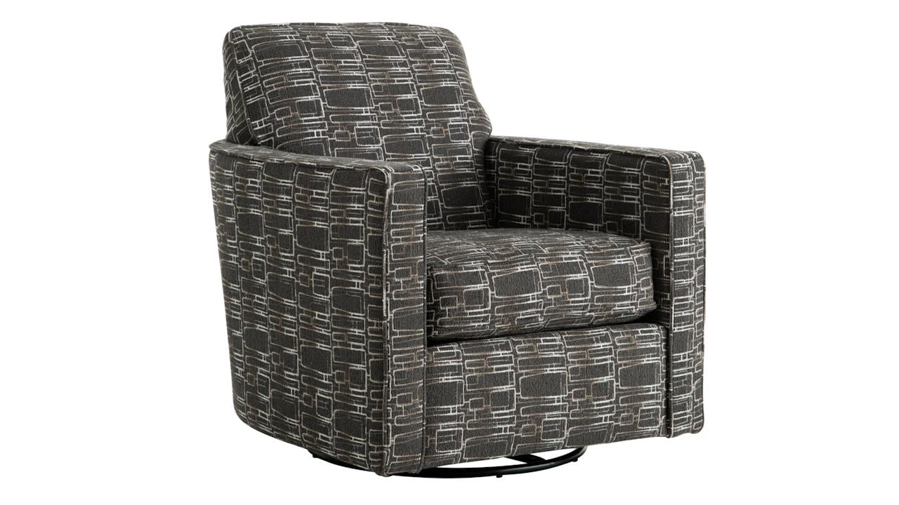 The Bri Swivel Chair in Gray combines comfort and style with its cushioned seat, padded armrests, geometric gray-patterned upholstery, and dark metal swivel base.