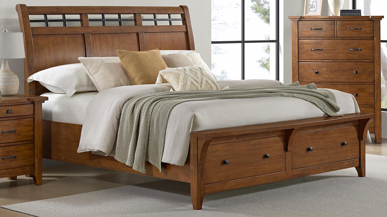 The Gage Sleigh Storage Bed in Chestnut blends traditional elegance with practical design, featuring windowpane headboard detailing and built-in footboard storage.