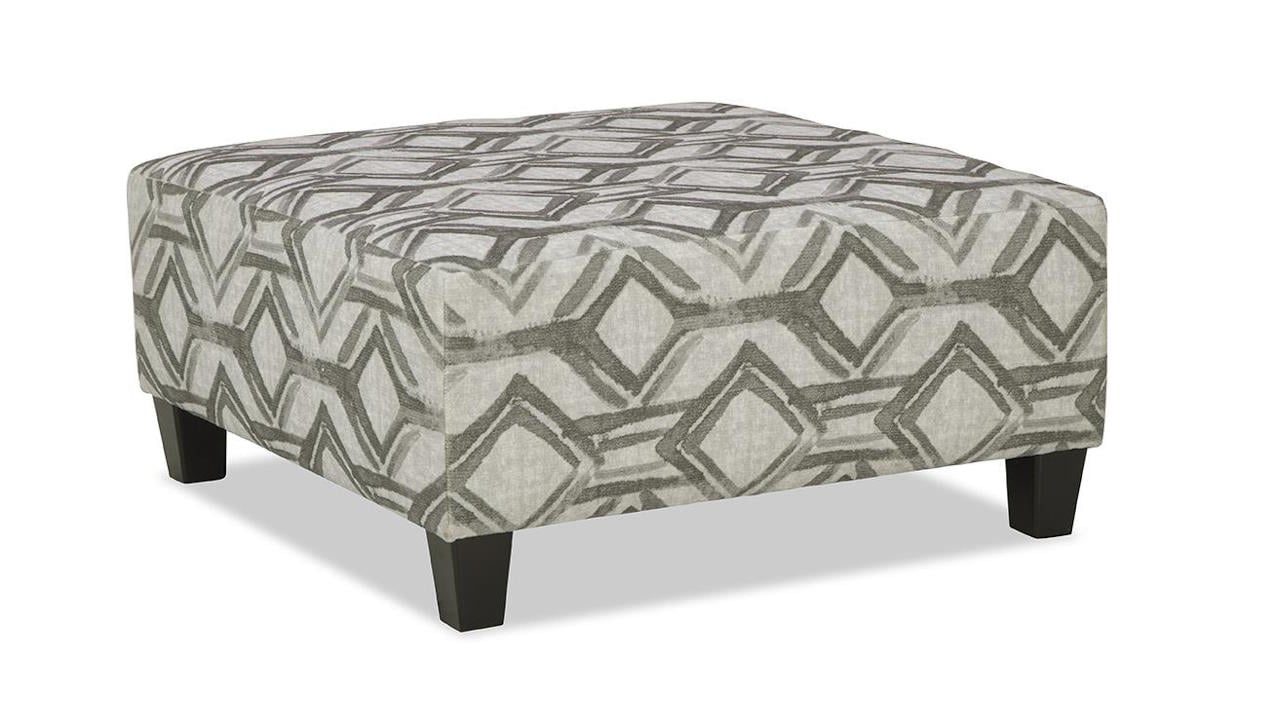 The Galactic Ottoman in Oyster combines modern design with functional comfort, featuring a bold geometric pattern in neutral tones, a plush cushioned top, and sturdy tapered wooden legs for a stylish and versatile addition to any space.