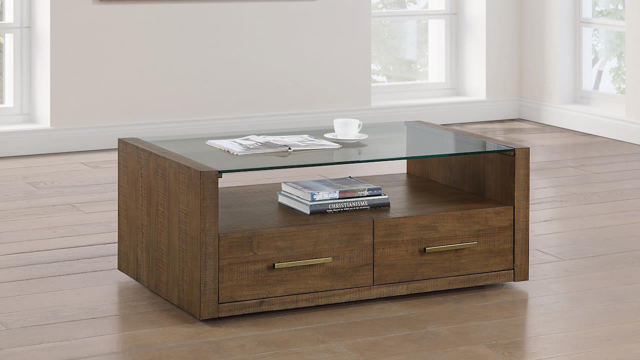 The Garland Gladd Coffee Table in Brown combines modern design and rustic charm with its warm toffee finish, clear glass top, two convenient drawers, and hidden casters for easy mobility, making it a stylish and functional centerpiece for any living room.