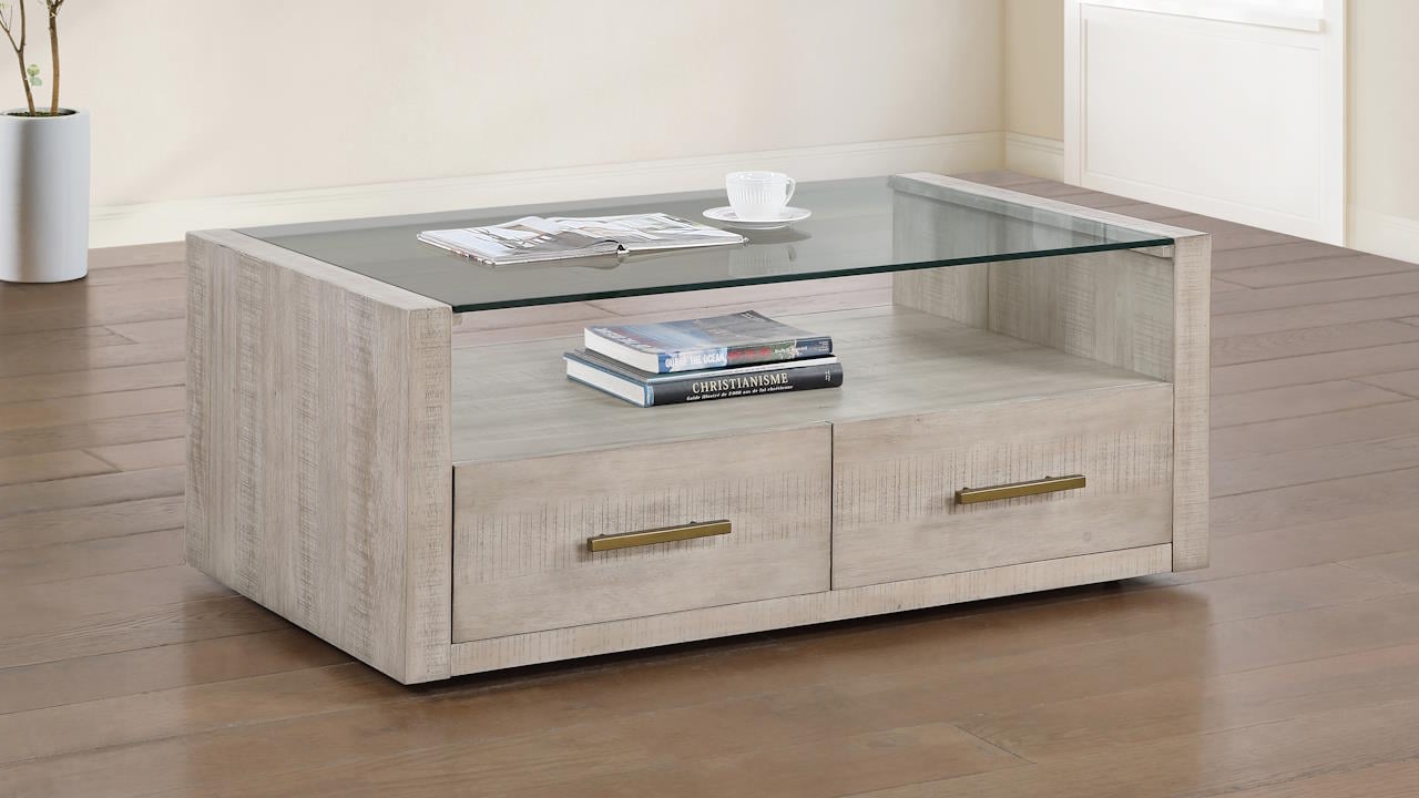 Enhance your living room with the Garland Glass Coffee Table in White, blending modern elegance and rustic charm with a clean white distressed finish, glass top, storage drawers, and hidden casters for easy mobility.