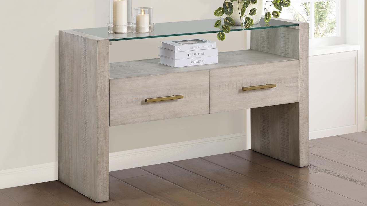 Bring casual elegance to your hallway, living room, or office with the Garland Glass Top Sofa Table in White, a blend of modern design and rustic charm. Its clean lines and saw rasp distressing in a clean white finish create a stunning console. The clear glass top offers an unobstructed display area, while two drawers provide practical storage for essentials. Functional and stylish, this versatile table enhances any space, adding both elegance and utility to your home. A chic addition to any décor.