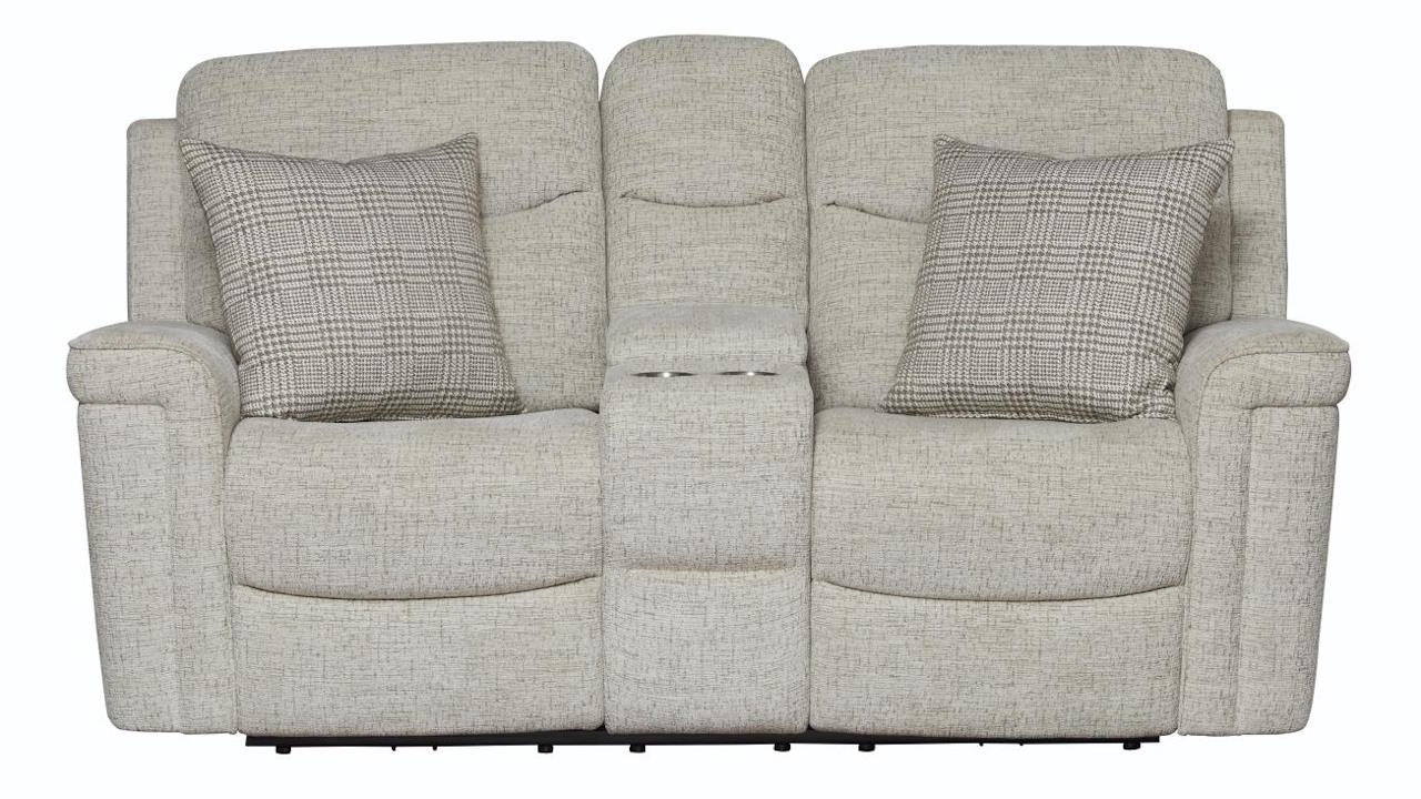 The Garland Dual Power Loveseat in Alabaster combines plush comfort with functional features, including reclining seats, an integrated console, and chic decorative pillows, perfect for cozying up in intimate living spaces.