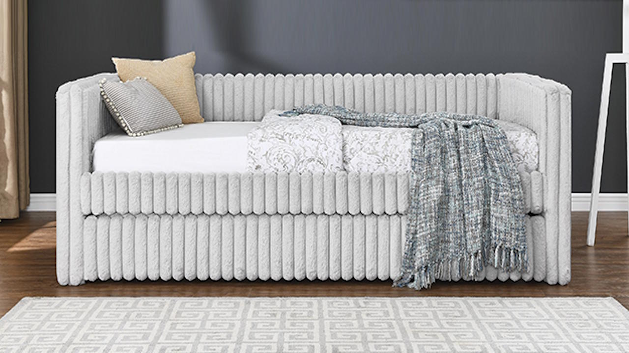 The Hailey Daybed with Trundle combines elegant channel-tufted upholstery with practical versatility, offering a stylish lounging space by day and a hidden guest bed by night.
