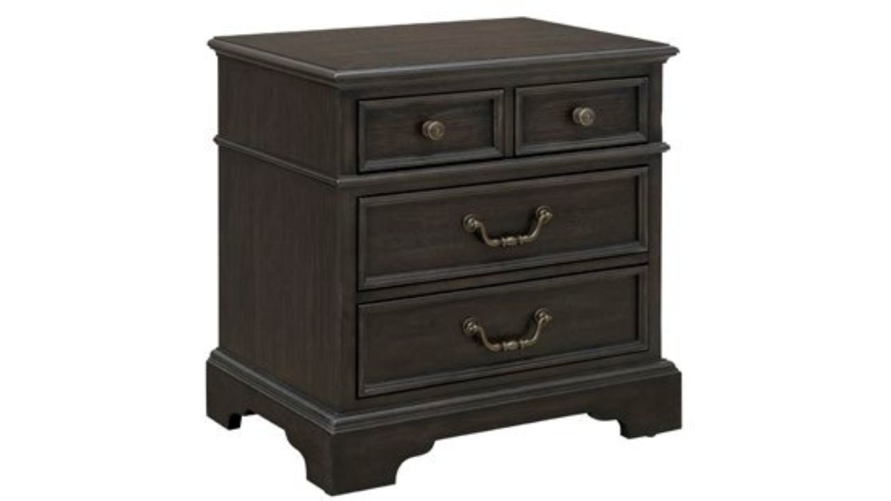 The Hickory Creek Nightstand is a sophisticated, charcoal-toned wooden nightstand featuring four spacious drawers, antique-style brass handles, intricate molding, and vintage-inspired bracket feet, making it a stylish and functional addition to any traditional or transitional space.