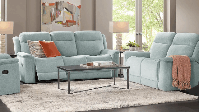 The Katherine Power Sofa Set offers plush comfort and modern convenience with dual power reclining, adjustable headrests, USB ports, and integrated storage, all in a serene seafoam woven fabric.
