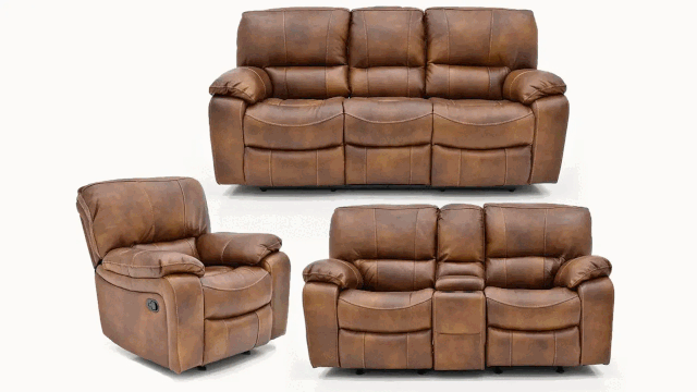 Legend Leather Reclining Sofa Set. Includes Reclining Sofa, Reclining Glider Loveseat, and Glider Recliner.