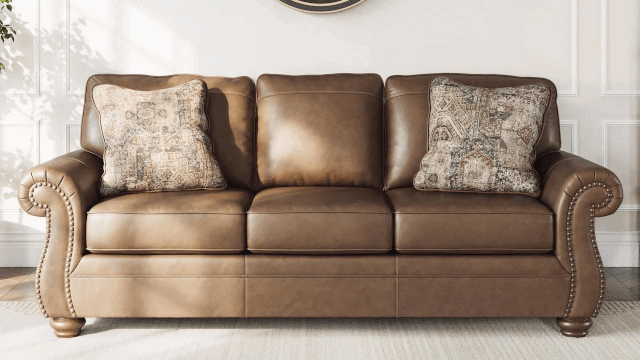 The Shadsburne Sofa combines classic roll-arm styling and nailhead trim with cozy, durable faux leather cushions and chenille pillows, all supported by a sag-resistant platform foundation for long-lasting comfort and elegance.