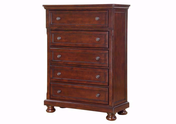 Sophia Chest of Drawers by Avalon Furniture. Dark Brown Cherry Finish. Lightly Distressed. 5 Drawers.