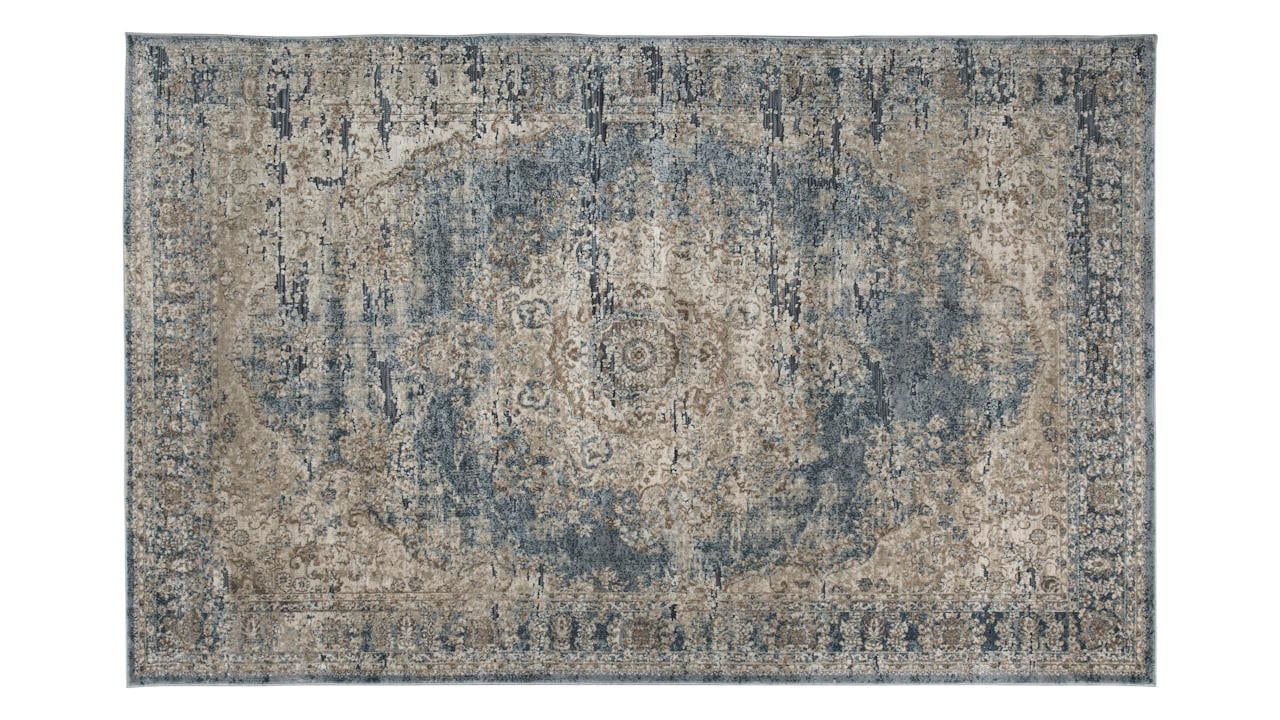 Return to timeless elegance with our South Rug, featuring a faux faded medallion motif and a soft 6mm pile blend of polypropylene, chenille, and polyester with a durable cotton backing.