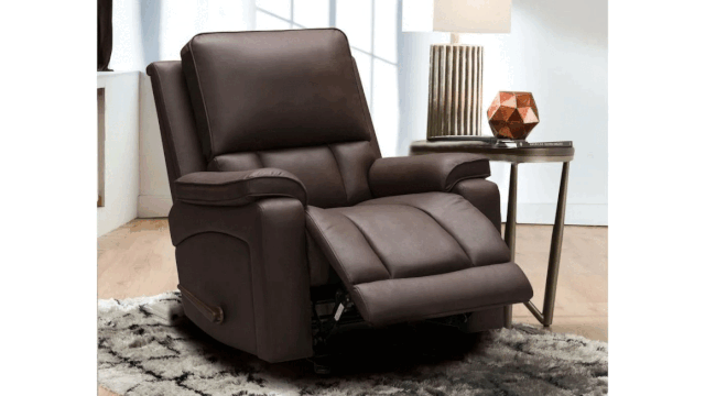 The Stapleton Glider Recliner offers stylish comfort with its plush design, high backrest, and modern leather-like upholstery, complemented by an easy-to-use lever mechanism for reclining.
