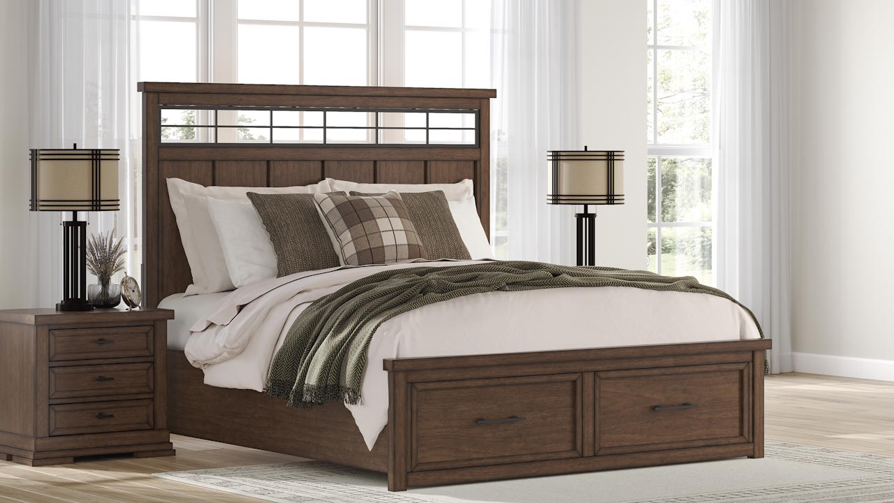 The Taffenbrook Storage Bed in Brown blends warm, rustic style with modern function, featuring a clean-lined design and built-in footboard drawers for added storage.