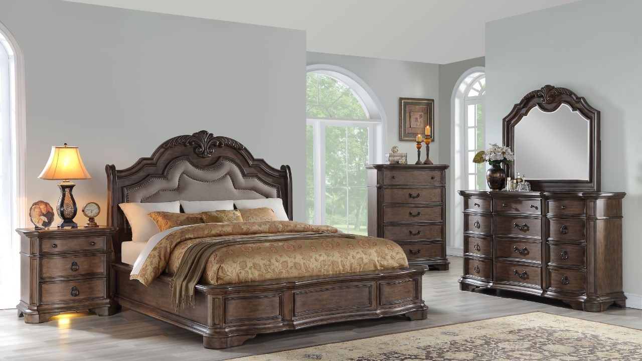 <span class=\"s1\"><strong>Key Features<br /></strong></span>\r\n<ul>\r\n<li>Light Brown Traditional Queen Size Bedroom Set</li>\r\n<li>Queen size bed, dresser with mirror, and nightstand</li>\r\n<li>Traditional panel style bed</li>\r\n<li>Light sandstone brown finish</li>\r\n<li>Upholstered headboard with easy care linen-look fabric</li>\r\n<li>Individual hand-applied nailhead trim</li>\r\n<li>Extensive carvings and molding details</li>\r\n<li>Durable and stylish marble veneer inlay tops on dresser and nightstand</li>\r\n<li>Dresser has felt lined jewelry tray</li>\r\n<li>Beveled mirror attached to dresser</li>\r\n<li>Cedar lined drawers</li>\r\n<li>Anitique brass finish on drawer knobs and pulls</li>\r\n<li>Nightstand has double USB and adjustable LED nightlight</li>\r\n<li>Bolt-on rail construction</li>\r\n<li>Poplar solids and birch veneers</li>\r\n</ul>\r\n<br />The Tulsa Queen Size Bedroom Set by Avalon Furniture emanates a rich and elegant traditional style. The ornate carvings, canted corners, and serpentine lines punctuate this traditional bedroom set. The panel bed features an overstuffed easy-care linen look upholstery with hand-applied nailhead trim on the carved frame of the headboard. Built with Poplar Solids and Birch veneers, the brown finish is warm and inviting and is complemented by antique brass hardware. Other features include a beautiful marble veneer inlay top on the dresser and nightstand with a felt-lined jewelry tray in the dresser. The nightstand offers two USB ports and an adjustable LED nightlight to conveniently keep your personal devices charged and ready to use. An elegant, traditional style and superb function can be yours with Tulsa Bedroom Collection. <br /><br />The Tulsa Queen Size Bedroom Set price includes dresser with mirror, 1 nightstand, and queen size bed. \r\n<p><a href=\"https://homefurn.com/mattress-center\"><strong><span>Mattress and foundation/box spring</span></strong></a><span><span> sold separately.</span></span></p>\r\n<br />\r\n<h3>Dimensions</h3>\r\n<table class=\"dimension-table\">\r\n<tbody>\r\n<tr>\r\n<th>Item</th>\r\n<th>Height</th>\r\n<th>Width</th>\r\n<th>Depth</th>\r\n</tr>\r\n<tr>\r\n<td>Queen Bed</td>\r\n<td>70</td>\r\n<td>71</td>\r\n<td>93</td>\r\n</tr>\r\n<tr>\r\n<td>Dresser and Mirror</td>\r\n<td>89</td>\r\n<td>72</td>\r\n<td>20.5</td>\r\n</tr>\r\n<tr>\r\n<td>Nightstand</td>\r\n<td>29</td>\r\n<td>29</td>\r\n<td>17</td>\r\n</tr>\r\n</tbody>\r\n</table>\r\n</div>\r\n<div class=\"data-product-videos\" data-product-videos=\"[["pmt80kso8k"]]\"></div>","isSoftKitOrContainsAddons":false,"price":2799.99,"priceFormatted":"$2,799.99","oldPrice":2799.99,"oldPriceFormatted":"$2,799.99","discountedPrice":2799.99,"discountedPriceFormatted":"$2,799.99","msrp":4199.97,"msrpFormatted":"$4,199.97","callForPrice":false,"stockQuantity":1,"displayStockAvailability":true,"displayStockQuantity":false,"stockMessage":"Low stock","minStockQty":2,"currencyCode":"USD","defaultPictureModel":{"ImageUrl":"https://cdn.homefurn.com/thumbs/0495844_tulsa-queen-size-bedroom-set-light-brown_1400.jpeg","ThumbImageUrl":"https://cdn.homefurn.com/thumbs/0495844_tulsa-queen-size-bedroom-set-light-brown_100.jpeg","FullSizeImageUrl":"https://cdn.homefurn.com/thumbs/0495844_tulsa-queen-size-bedroom-set-light-brown.jpeg","Title":"Picture of Tulsa Queen Size Bedroom Set - Light Brown","AlternateText":"Picture of Tulsa Queen Size Bedroom Set - Light Brown","Id":0,"CustomProperties":{}},"pictureModels":[{"ImageUrl":"https://cdn.homefurn.com/thumbs/0495844_tulsa-queen-size-bedroom-set-light-brown_1400.jpeg","ThumbImageUrl":"https://cdn.homefurn.com/thumbs/0495844_tulsa-queen-size-bedroom-set-light-brown_100.jpeg","FullSizeImageUrl":"https://cdn.homefurn.com/thumbs/0495844_tulsa-queen-size-bedroom-set-light-brown.jpeg","Title":"Picture of Tulsa Queen Size Bedroom Set - Light Brown","AlternateText":"Picture of Tulsa Queen Size Bedroom Set - Light Brown","Id":0,"CustomProperties":{}},{"ImageUrl":"https://cdn.homefurn.com/thumbs/0044144_tulsa-queen-size-bedroom-set-light-brown_1400.jpeg","ThumbImageUrl":"https://cdn.homefurn.com/thumbs/0044144_tulsa-queen-size-bedroom-set-light-brown_100.jpeg","FullSizeImageUrl":"https://cdn.homefurn.com/thumbs/0044144_tulsa-queen-size-bedroom-set-light-brown.jpeg","Title":"Picture of Tulsa Queen Size Bedroom Set - Light Brown","AlternateText":"Picture of Tulsa Queen Size Bedroom Set - Light Brown","Id":0,"CustomProperties":{}},{"ImageUrl":"https://cdn.homefurn.com/thumbs/0044142_tulsa-queen-size-bedroom-set-light-brown_1400.jpeg","ThumbImageUrl":"https://cdn.homefurn.com/thumbs/0044142_tulsa-queen-size-bedroom-set-light-brown_100.jpeg","FullSizeImageUrl":"https://cdn.homefurn.com/thumbs/0044142_tulsa-queen-size-bedroom-set-light-brown.jpeg","Title":"Picture of Tulsa Queen Size Bedroom Set - Light Brown","AlternateText":"Picture of Tulsa Queen Size Bedroom Set - Light Brown","Id":0,"CustomProperties":{}},{"ImageUrl":"https://cdn.homefurn.com/thumbs/0044139_tulsa-queen-size-bedroom-set-light-brown_1400.jpeg","ThumbImageUrl":"https://cdn.homefurn.com/thumbs/0044139_tulsa-queen-size-bedroom-set-light-brown_100.jpeg","FullSizeImageUrl":"https://cdn.homefurn.com/thumbs/0044139_tulsa-queen-size-bedroom-set-light-brown.jpeg","Title":"Picture of Tulsa Queen Size Bedroom Set - Light Brown","AlternateText":"Picture of Tulsa Queen Size Bedroom Set - Light Brown","Id":0,"CustomProperties":{}},{"ImageUrl":"https://cdn.homefurn.com/thumbs/0044145_tulsa-queen-size-bedroom-set-light-brown_1400.jpeg","ThumbImageUrl":"https://cdn.homefurn.com/thumbs/0044145_tulsa-queen-size-bedroom-set-light-brown_100.jpeg","FullSizeImageUrl":"https://cdn.homefurn.com/thumbs/0044145_tulsa-queen-size-bedroom-set-light-brown.jpeg","Title":"Picture of Tulsa Queen Size Bedroom Set - Light Brown","AlternateText":"Picture of Tulsa Queen Size Bedroom Set - Light Brown","Id":0,"CustomProperties":{}},{"ImageUrl":"https://cdn.homefurn.com/thumbs/0044146_tulsa-queen-size-bedroom-set-ligh