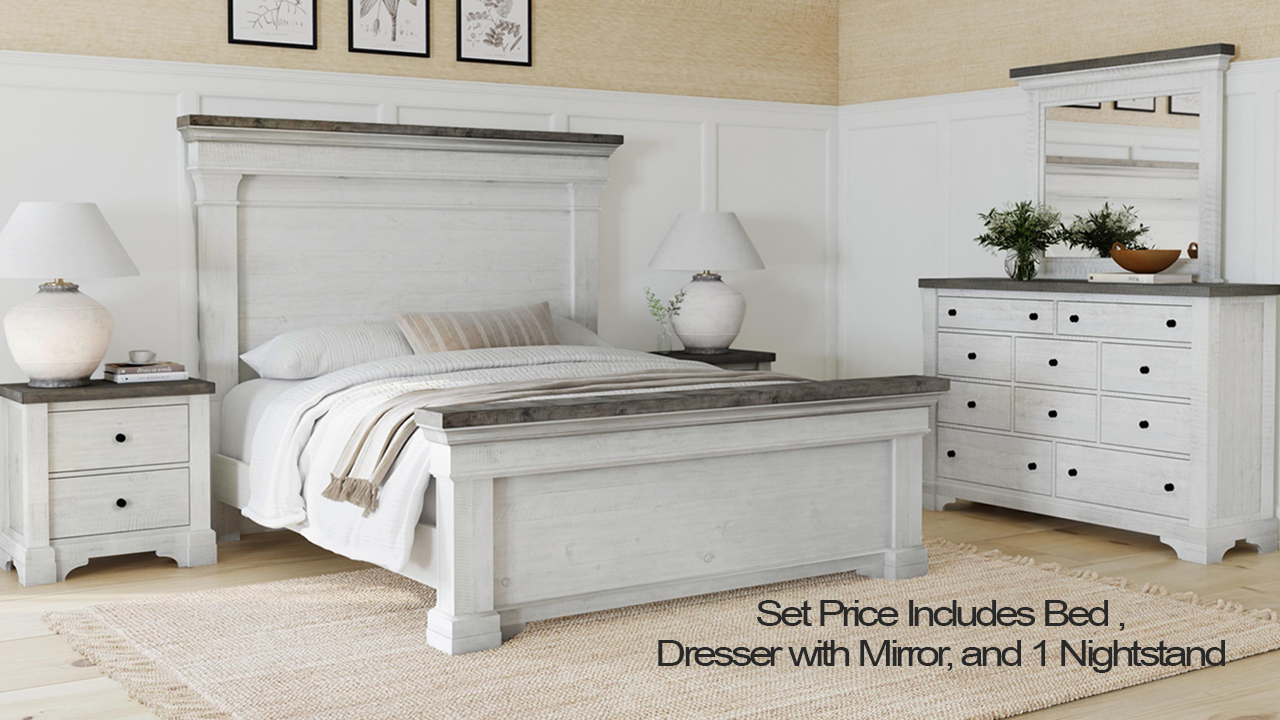 </strong> </span>\r\n<ul>\r\n<li>Distressed white and gray finishes</li>\r\n<li>Constructed of wood veneers and solids</li>\r\n<li>Dovetail drawer construction</li>\r\n<li>Transitional Farmhouse design</li>\r\n<li>Lights located in top rail of the headboard</li>\r\n<li>USB ports on back of nightstand</li>\r\n<li>Bronze finished hardware</li>\r\n</ul>\r\n<p class=\"x_x_MsoNormal\">Escape to the country with the Valley Ridge Queen Size Bedroom Set by Samuel Lawrence. This transitional styled bedroom set features a beautiful white distressed finish with a gray finish on top of each piece. The bed features built-in lighting on the top rail of the headboard while the case pieces are each accented with decorative bronze-finished hardware and elegant bracket-designed feet. Built to last with sturdy construction and quality materials, this queen size bedroom set will bring many years of sweet dreams to come.</p>\r\n<div class=\"data-product-videos\" data-product-videos=\"[["sqaxoa5u0f"]]\"></div>\r\n</div>","isSoftKitOrContainsAddons":false,"price":2999.99,"priceFormatted":"$2,999.99","oldPrice":2999.99,"oldPriceFormatted":"$2,999.99","discountedPrice":2999.99,"discountedPriceFormatted":"$2,999.99","msrp":3829.97,"msrpFormatted":"$3,829.97","callForPrice":false,"stockQuantity":2,"displayStockAvailability":true,"displayStockQuantity":false,"stockMessage":"Low stock","minStockQty":2,"currencyCode":"USD","defaultPictureModel":{"ImageUrl":"https://cdn.homefurn.com/thumbs/0524821_valley-ridge-queen-size-bed-set-off-white-with-gray_1400.jpeg","ThumbImageUrl":"https://cdn.homefurn.com/thumbs/0524821_valley-ridge-queen-size-bed-set-off-white-with-gray_100.jpeg","FullSizeImageUrl":"https://cdn.homefurn.com/thumbs/0524821_valley-ridge-queen-size-bed-set-off-white-with-gray.jpeg","Title":"Picture of Valley Ridge Queen Size Bed Set – Off White with Gray","AlternateText":"Picture of Valley Ridge Queen Size Bed Set – Off White with Gray","Id":0,"CustomProperties":{}},"pictureModels":[{"ImageUrl":"https://cdn.homefurn.com/thumbs/0524821_valley-ridge-queen-size-bed-set-off-white-with-gray_1400.jpeg","ThumbImageUrl":"https://cdn.homefurn.com/thumbs/0524821_valley-ridge-queen-size-bed-set-off-white-with-gray_100.jpeg","FullSizeImageUrl":"https://cdn.homefurn.com/thumbs/0524821_valley-ridge-queen-size-bed-set-off-white-with-gray.jpeg","Title":"Picture of Valley Ridge Queen Size Bed Set – Off White with Gray","AlternateText":"Picture of Valley Ridge Queen Size Bed Set – Off White with Gray","Id":0,"CustomProperties":{}},{"ImageUrl":"https://cdn.homefurn.com/thumbs/0045669_valley-ridge-queen-size-bed-set-off-white-with-gray_1400.png","ThumbImageUrl":"https://cdn.homefurn.com/thumbs/0045669_valley-ridge-queen-size-bed-set-off-white-with-gray_100.png","FullSizeImageUrl":"https://cdn.homefurn.com/thumbs/0045669_valley-ridge-queen-size-bed-set-off-white-with-gray.png","Title":"Picture of Valley Ridge Queen Size Bed Set – Off White with Gray","AlternateText":"Picture of Valley Ridge Queen Size Bed Set – Off White with Gray","Id":0,"CustomProperties":{}},{"ImageUrl":"https://cdn.homefurn.com/thumbs/0045670_valley-ridge-queen-size-bed-set-off-white-with-gray_1400.png","ThumbImageUrl":"https://cdn.homefurn.com/thumbs/0045670_valley-ridge-queen-size-bed-set-off-white-with-gray_100.png","FullSizeImageUrl":"https://cdn.homefurn.com/thumbs/0045670_valley-ridge-queen-size-bed-set-off-white-with-gray.png","Title":"Picture of Valley Ridge Queen Size Bed Set – Off White with Gray","AlternateText":"Picture of Valley Ridge Queen Size Bed Set – Off White with Gray","Id":0,"CustomProperties":{}},{"ImageUrl":"https://cdn.homefurn.com/thumbs/0045671_valley-ridge-queen-size-bed-set-off-white-with-gray_1400.png","ThumbImageUrl":"https://cdn.homefurn.com/thumbs/0045671_valley-ridge-queen-size-bed-set-off-white-with-gray_100.png","FullSizeImageUrl":"https://cdn.homefurn.com/thumbs/0045671_valley-ridge-queen-size-bed-set-off-white-with-gray.png","Title":"Picture of Valley Ridge Queen Size Bed Set – Off White with Gray","AlternateText":"Picture of Valley Ridge Queen Size Bed Set – Off White with Gray","Id":0,"CustomProperties":{}},{"ImageUrl":"https://cdn.homefurn.com/thumbs/0045672_valley-ridge-queen-size-bed-set-off-white-with-gray_1400.png","ThumbImageUrl":"https://cdn.homefurn.com/thumbs/0045672_valley-ridge-queen-size-bed-set-off-white-with-gray_100.png","FullSizeImageUrl":"https://cdn.homefurn.com/thumbs/0045672_valley-ridge-queen-size-bed-set-off-white-with-gray.png","Title":"Picture of Valley Ridge Queen Size Bed Set – Off White with Gray","AlternateText":"Picture of Valley Ridge Queen Size Bed Set – Off White with Gray","Id":0,"CustomProperties":{}},{"ImageUrl":"https://cdn.homefurn.com/thumbs/0045673_valley-ridge-queen-size-bed-set-off-white-with-gray_1400.png","ThumbImageUrl":"https://cdn.homefurn.com/thumbs/0045673_valley-ridge-queen-size-bed-set-off-white-with-gray_100.png","FullSizeImageUrl":"https://cdn.homefurn.com/thumbs/0045673_valley-ridge-queen-size-bed-set-off-white-with-gray.png","Title":"Picture of Valley Ridge Queen Size Bed Set – Off White with Gray","AlternateText":"Picture of Valley Ridge Queen Size Bed Set – Off White with Gray","Id":0,"CustomProperties":{}},{"ImageUrl":"https://cdn.homefurn.com/thumbs/0045674_valley-ridge-queen-size-bed-set-off-white-with-gray_1400.png","ThumbImageUrl":"https://cdn.homefurn.com/thumbs/0045674_valley-ridge-queen-size-bed-set-off-white-with-gray_100.png","FullSizeImageUrl":"https://cdn.homefurn.com/thumbs/0045674_valley-ridge-queen-size-bed-set-off-white-with-gray.png","Title":"Picture of Valley Ridge Queen Size Bed Set – Off White with Gray","AlternateText":"Picture of Valley Ridge Queen Size Bed Set – Off White with Gray","Id":0,"CustomProperties":{}}],"productSpecificationAttributes":[{"specificationAttributeId":2,"specificationAttributeName":"Height","valueRaw":"72","ColorSquaresRgb":null,"showOnProductPage":false,"displayOrder":0},{"specificationA