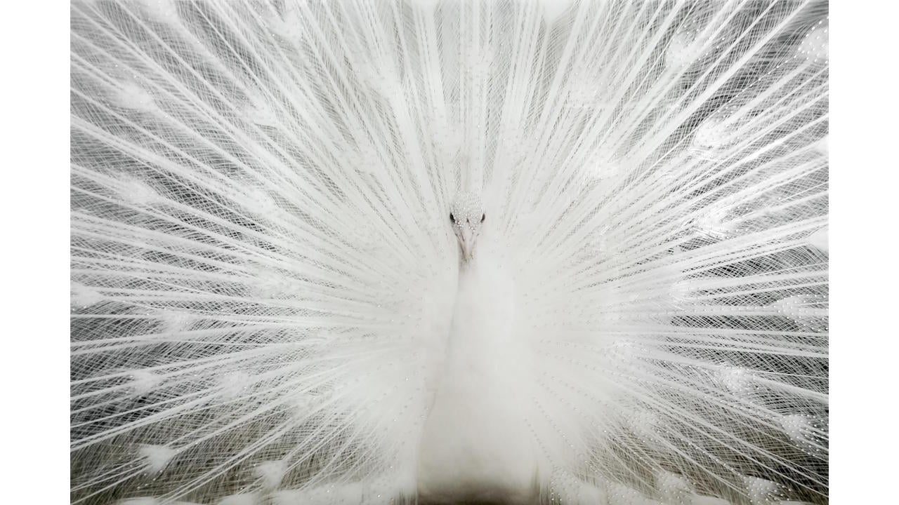 The White Peacock Wall Art is a 40" x 60" tempered glass piece featuring shimmering foil and rhinestone accents for a striking, elegant statement.